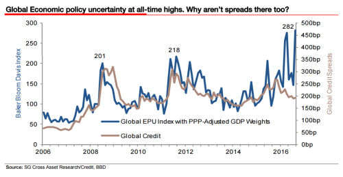 The chart by Guy Stear, head of emerging markets and credit research at Société Générale, shows credit spreads holding steady even as political uncertainty spikes to an unprecedented level.