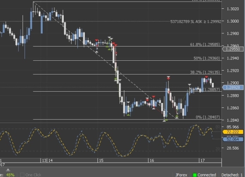 The price movement for the current GBPUSD pair, with technical analysis looking at the STOCH indicators (5, 3, SMA, 3, SMA) and touch the upper border of the resistant and lower bounds of support by using Fibonacci Retracements. Like the picture above, I will decide Sell.