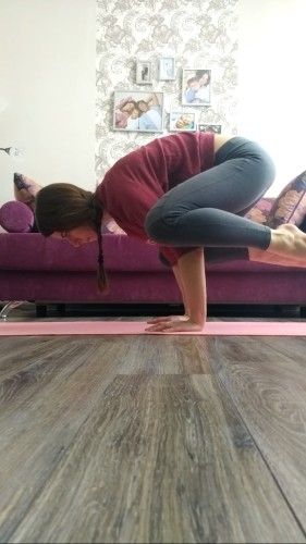 я занимаюсь йогой периодически дома, и вот у меня получилось освоить несколько асанов. Конечно, они далеко не самые сложные, но для меня это маленькое достижение!) Поза журавля (Бакасана).