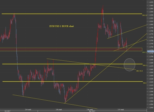 Here you will find a 1 HOUR chart of EURUSD with multiple trendlines. At the moment the price action acts as if it will go down in the short term.