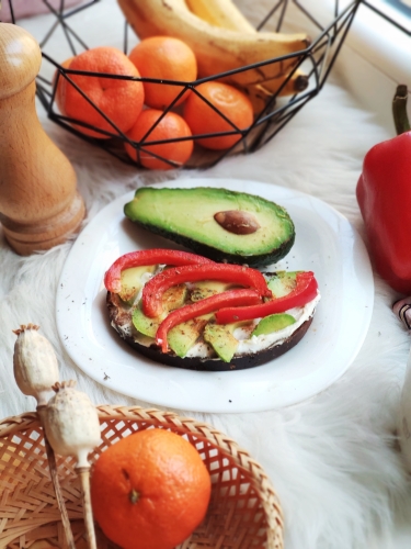 ✨Итак, рецепт идеального тоста с авокадо: берём чёрный цельнозерновой хлеб (можно использовать рисовый хлебец, это значительно снизит количество углеводов), намазываем щедро мягкий сыр по типу филадельфии, нарезаем авокадо и красный болгарский перец и кладём поверх сыра.