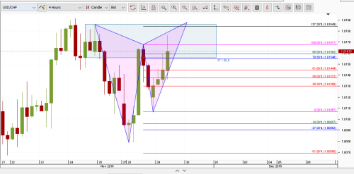 I found a potential Gartley pattern on USD/CHF. I think the price will rise to the 127.20 level because it will bounce from the level of supply and then it will fall to the -27.00 blue Fibonacci level, so I believe it is a good opportunity for sell.