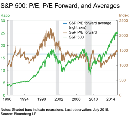 One variant of the forward P/E ratio is the S&P forward P/E ratio, which is computed with the price and earnings of the 500 stocks that comprise the S&P 500 index, allowing us to track the valuation of a large sample of companies over time. The average S&P 500 P/E forward ratio for the period 1990 to July 2015 is 16.5. The forward P/E rose dramatically in the late 1990s, in retrospect perhaps signaling the end of the stock market boom.