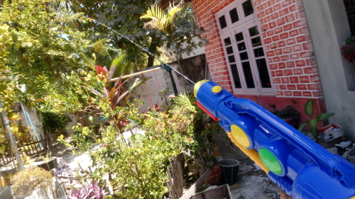 I was ready with my heavy pistol and sooner than later, the thumbs up came and I shot the water cannonross the wall. Then, to my surprise, there was a chuckle immediately after this. it was Sitham. He could not suppress his amusement as he saw the boy who was passing by,just scampered to avoid the water drops. (Sitham enacted that part with lot of excitement, he told me that it was a grade 12 student who was staying a few crosses away from our spot). I thought my young friend had inadvertently revealed my plan in his excitement. But nothing followed as the boy might have thought that someone was watering the plants.