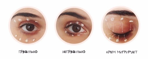Крем для глаз наносится безымянными пальцами, так как они самые слабые, и не могут причинить вреда столь мягкой и чувствительной коже.