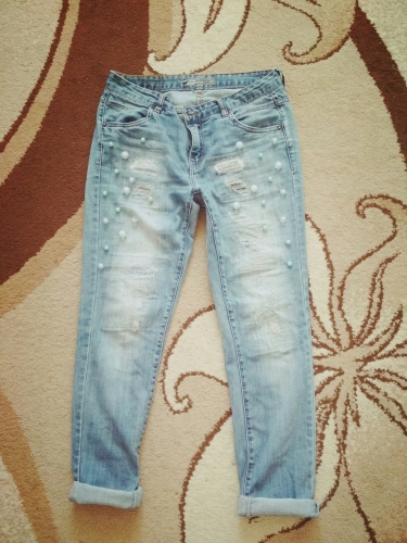 Год назад у меня появились джинсы я просто была без ума от них. Но сейчас они мне надоели и я решила нужно что то поменять в них. Я нашла бусины от своих старых бус и пришила их. Вот что получилось