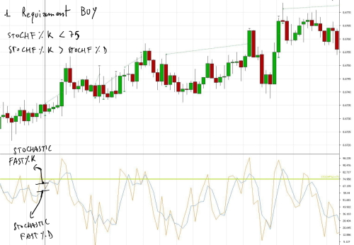 The strategy include a simple moving average, a fast stochastic and standard stochastic indicators.