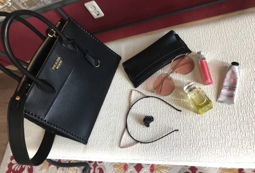 Now Let's proceed to my bag. I have my Prada bag, it is nice and full. I love this bag because it hold so much staff and it's great for traveling. Whenever I travel I always bring this bag with me bacause it fit so much extra staff which I need. I like to bring so many things. I got this bag 5 month back for my birthday. I'm obsessed to this bag and I use it all the time? I really make sense to get on use all the time. I use it almost every day bacause of black color, it is really convenient. I have my perfume in it, it's called HERMES Le Jardin de Monsieur Li. I'm in love with it! I like to keep it in my bag because it so small.