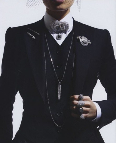 One of my favorite outfits is a woman's black suit (firsty appeared in 1966 in the collection of Yves Saint Laurent , which at the beginning was not well perceived by the people, even in some public places like restaurants it was banned to wear them , but then it became a huge trend and strongly desirable fashion garment ) , with a jerkin and white shirt underneath being worn with the broche on at the top of the shirt with many necklaces and rings. Suitable for every occasion , starting from work and finishing by going out somewhere in the evening.