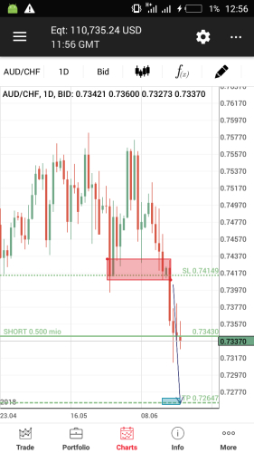 Audchf was ranging months ago between 0.743 and 0.756, this month it broke down with the overall sell trend , I'm selling to take profit at region 0.726 following a recent rejection at 0.735 with formation of a pin bar