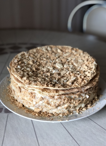 Итак, нашла я рецепт в интернете, разгрузила весь свой день, т.к. понимала, что времени потребуется немало, купила все ингредиенты и, с невероятным воодушевлением и интересом, приступила к делу!!! Сказать, что было трудно- ничего не сказать)))) Раскатывая каждый из 30 коржей слоёного теста, мне казалось, что я затрачиваю в разы больше сил и энергии, нежели в своём тренажёрном зале ))) Но после 8 часов мучений результат превзошёл все мои ожидания !!!! Тортик получился невероятно вкусным, родители и братик были в приятном удивлении от моего сюрприза, а я была невероятно горда за себя, то что исполнила своё же желание))))