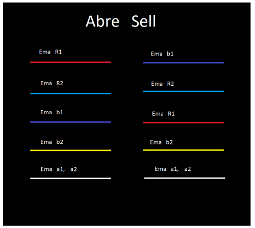 EMA ---> a (a1, a2) ---> La media exponencial que he llamado "a" es una media rápida de 2 periodos que se desdobla en 2, que serían como dos medias independientes a1 y a2, cada una de ellas representaría un periodo distinto de la misma media móvil. Esta media móvil sería como una aproximación al precio, con un ligero retardo y será la que determinará si hay que abrir o cerrar posiciones y si deben ser largas o cortas según la colocación de estas medias respecto a las otras cuatro.