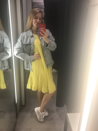 Первым образом, который я подобрала, было ярко желтое платье с белыми кроссовками и сверху дополнила этот образ джинсовкой. Образ получился очень стильным и спортивным. Такое сочетание вещей для меня немного необычно, потому что предпочитала носить платья лишь с каблуками, но как оказалось это очень удобно и комфортно!)