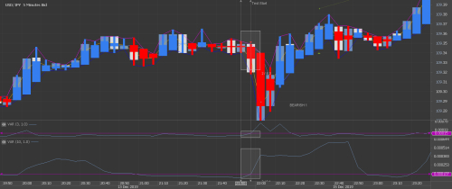 To have an opportunity to open a buy position the logic is that the Heikin-Ashi lines open (of the price shifted of one and two values) are greater than the close. The setting of this indicator is the standard setting (bid, closing price calculation) with 5 Min and USD/JPY. The entry is bounded to the Variance, the second indicator. The Variance is set on a 5 Min chart and to trigger the open position its value on a 3 period should be greater than its value on a 10 period. The objective of using this statistical indicator is to extrapolate only that dynamics with great spread from the average, this can be in view as a measure of a notable starting trend. To open a sell positions similarly the Heikin-Ashi lines close are greater than the open (of the price shifted of one and two values) while the variance logic is the same.