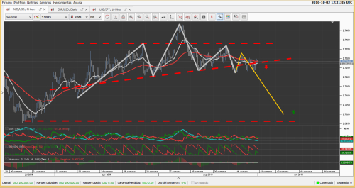 Análisis Técnico Nzd/Usd, para el 1 de Diciembre de 2016. Objetivo 0.7000. 2ª Revisión El día 3 de octubre, publiqué 1 artículo para el concurso de Análisis Técnico del 1 de diciembre, y el 31 de octubre la 1ª Revisión. Esta sería una segunda revisión de aquel artículo sobre el par Nzd/Usd, titulado: “Preparándose para la caída” Creo que los gráficos y el texto que voy a exponer son fáciles de entender; aunque no se haya leído el primer artículo, ni la revisión anterior, pues para ello repetiré algún gráfico; pero para una mejor comprensión y saber como hemos llegado hasta aquí, creo que sería de mucha utilidad, leer primero el artículo original y después las revisiones. Para empezar, vamos a recordar como estaba el precio cuando publiqué el artículo del día 3 de octubre, en los gráficos de 4 horas y diario, así como la previsión, línea amarilla y flechas roja y verde: Gráfico 1 (Es el mismo gráfico de 4 horas del artículo: “Preparándose para la caída”, publicado el 3 de octubre)