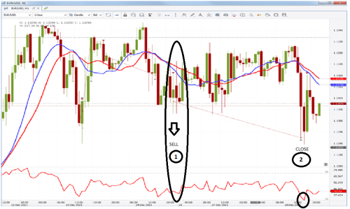 Шаг 4. Закрытие позиции производим если изменился тренд на часовом графике (для позиции SELL если 14-периодная SMA на часовом графике оказалась выше 20-периодной и наоборот для позиции BUY), либо 12-периодный RSI на часовом графике оказался меньше значения 29 ( как это произошло в точке 2 на рис.1), либо по стоп лоссу.