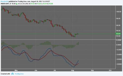 The US dollar weakness in july seem to have halted for the time being as the MACD on daily chart has crossed to upside indicating halt in downward momentum. So Dollar index is likely to be in a rangebound condition for next few days. Also 92.5 to 93 is a good long term support level where it has bounced from. If the chart forms a double bottom here at 93, then it would test 95 in coming week. Euro likely to test 1.2 level and that would be likely bottom of dollar index.