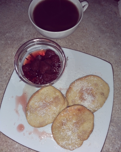 Жарим на оливковом масле, добавляем по ложке теста накрываем, жарим пару минут на медленном огне, после добавляем ещё по одной ложке и жарим ещё немного, после ещё одна, так блины получиться пышными и воздушными. Я их подаю с джемом также без сахара, медом и кокосовой стружкой.
