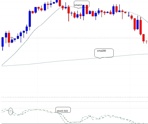 The strategy opens short positions when the following conditions are met: the price is lower than the SMA 200 and smaller as SMA 12 but STOCH must be higher than its previous value.