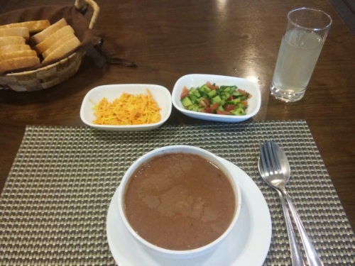 smashed bean soup, carrot salad, cucumber, tomato and greens salad plus compot-stewed fruit.