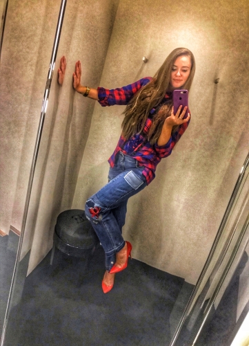 На первом фото я предложила вам сочетание клетчатой рубашки вместе с объемными джинсами и замшевыми каблуками. Вместо каблуков можно надеть высокие замшевые сапоги или ковбойские сапоги. Этот образ очень удобен и практичен в будние дни.