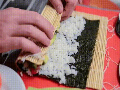 ПРИГОТОВЛЕНИЕ:Рис для роллов сварить по правилам: промыть в холодной воде, залить водой в соотношении на 1 часть риса 1,25 части воды, довести до закипания, убавить огонь, закрыть крышкой и не открывать 14 минут, потом снять с огня, можно при желании добавить рисовый уксус, перемешать аккуратно, остудить. Форель (или другую красную рыбу) нарезать продолговатыми кусочками, можно использовать целый длинный кусочек или сложить начинку из нескольких коротких. Авокадо очистить и нарезать вдоль на кусочки (так же можно использовать огурец, который тоже нарезать продольно). Коврик макису или салфетку-циновку нужно обязательно обернуть пищевой плёнкой, так будет намного удобнее. Стандартный лист нори разрезать на 2 половины и положить блестящей стороной на циновку.На нори выложить тонкий слой риса следующим образом: с одной стороны оставить 1,5 см нори без риса, а с другой стороны, так сказать, выехать рисом тоже на 1,5 см.Примечание: перед тем как взять рис, руки нужно смочить в воде с уксусом. Затем циновку сложить вдвое, т.е. накрыть рис. Перевернуть таким образом, чтобы рис оказался внизу, а нори наверху. И посередине выложить начинку. Свернуть ролл и аккуратно обжимая придать ему круглую или квадратную форму. В итоге получится вот такой ролл рисом наружу. Можно было сразу посыпать циновку кунжутом, но я это сделала уже после сворачивания: посыпала кунжутом и покатала по нему ролл. Нужно дать роллу немного полежать, а потом нарезать его на кусочки острым смоченным в воде ножом. Ролл рисом наружу - урамаки готов. Приятного аппетита!