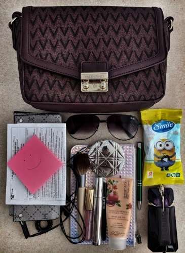 I have a little cosmetic bag to keep the essential products that I will need to touch up my make up during the day, a perfume or two depending on my mood a hand lotion to keep my hands hydrated and young sunglasses to protect me from the sun, headphones to listen my relaxing music ❤️ Next, I carry my wallet of course, and some bills' cause we are responsible adults wet wipes - you never know what could happen, right?)) then, a pen and sticky notes, inspiration comes when unexpected, so I need to write ideas down ✍️