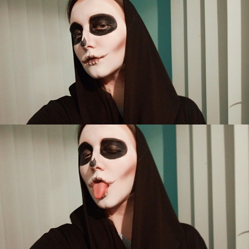 "С днем всех святых!", — прокричала она, громко хохоча.