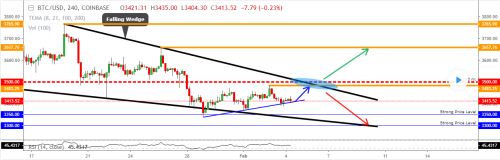 The price goes into the strong crossing area. There is a recent short-term higher high (orange line), there is the round number $3,500 which works as a resistance AND there is a Falling Wedge upper trendline which works also as resistance.