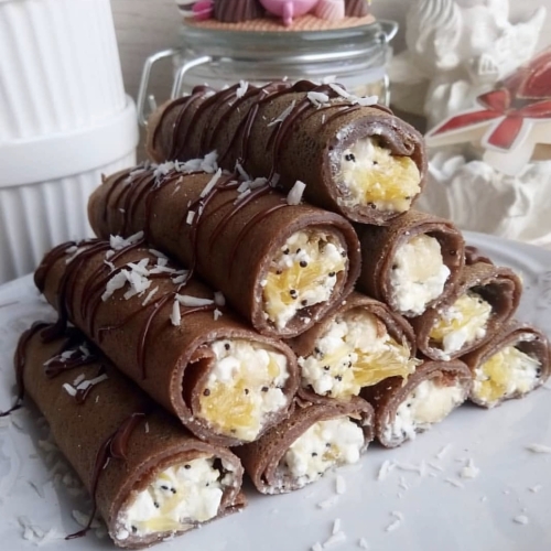 Из теста выпекаем блинчики , творог и фрукты смешиваем, наносим на край блинчика начинкам и скручиваем в трубочки. Причиного аппетита!