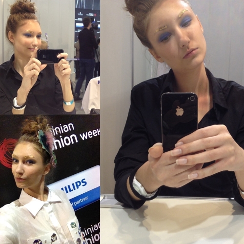 I just want to show you my make up from Ukraine Fashion Week.I had gold Eyebrows and crazy blue eyes. I thought in Kiev people can't surprise of anything but my make up at 11 pm surprise them a lot ))