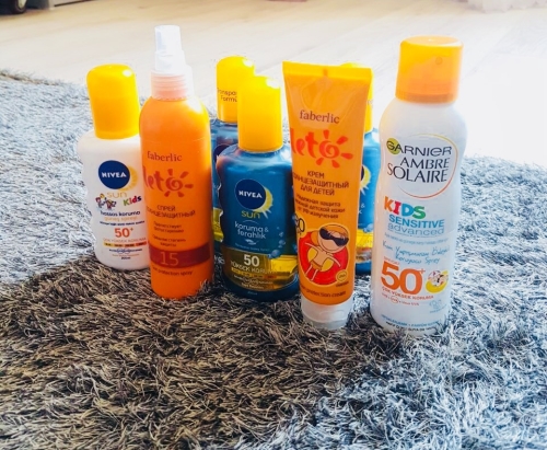 3.мне нравится использовать детские крема так как они бережно защищают кожу от жарких солнечных лучей они у меня из серии Faberlic спрей и крем