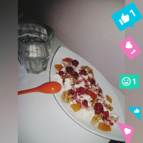Хочу поделиться с вами моим любимым перекусом, то что я кушаю каждый день у уже не могу даже представить свое существования без этого- творог с орехами, малиной,курагой и сладким джемом (творог домашний,фрукты меняю,джем из смородины, готовила сама).