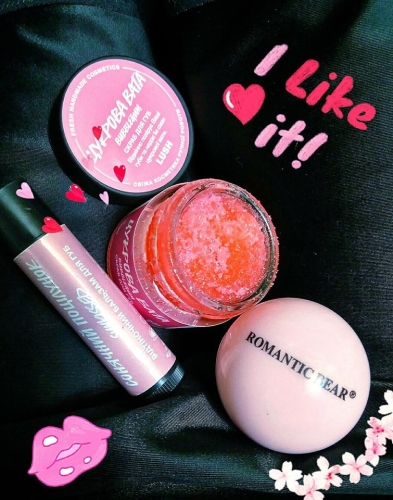Питание - далее я наношу бальзам Romantic Bear . На ночь этого достаточно. Днем я добавляю бальзам LUSH "Солнечный поцелуй". Поистине верный помощник. У него легкий перламутрово розовый оттенок и богатый состав : свежие бананы, овсянка , масло арганы и лаванда. Между прочим последняя помогает заживлению микротрещинок. Запах у бальзама очень необычный и сохраняется надолго.