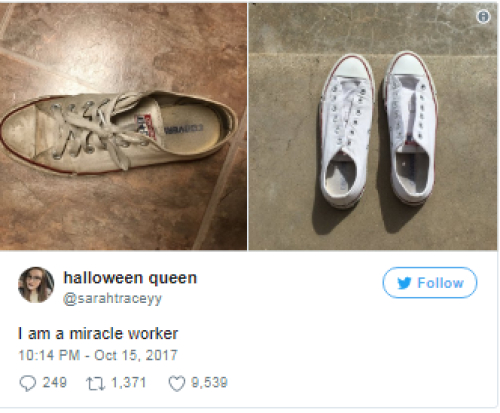 Никто не покупает белые кроссовки, думая, что они перестанут быть яркими и чистыми навсегда. Новый вирусный твит дает всем надежду, что можно восстановить обувь до своего первоначального состояния - даже после того, как она пройдёт через грязь.Вот что добавил твиттер-пользователь @sarahtraceyy, показывая фотографии до и после, его кроссовок Converse с надписью «Я чудотворец». Поскольку с тех пор на его твит сделали репост почти 99 000 раз, можно с уверенностью сказать, что мир согласен.
