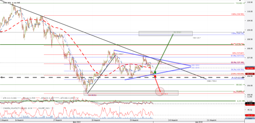 На часовом графике можно увидеть формирование фигуры треугольник. В процессе реализации этой фигуры цена встречает сильное сопротивление в виде скользящих средних, линии нисходящего тренда от 8 января 2018 года. Рассчитываю поэтому, что цена будет консолидироваться внутри фигуры. Открыт лонг от нижней границы 106,625 с целью верхней границы фигуры 107.225.