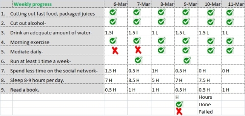 I am sharing my weekly progress measure. It looks like that I am on track but have failed in few areas. I was miscalculated my daily amount of water as 1.5 l until I found today that it has to be 2.1 l per day based on my age, height, weight, and nature of work I do. So I will increase it to 2.1 L from next week onwards.