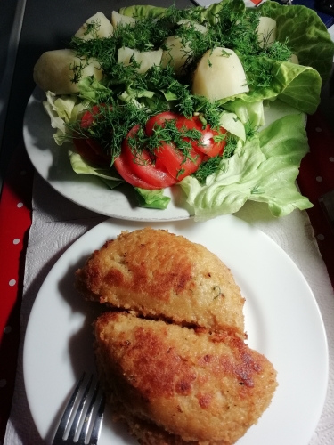 Today's dinner comprised of 2 pieces of read made cordon bleu, that is chicken fillet with some ham and cheese inside. Complementing the meat were potatoes and cabbage from this year's crop as well as lettece and tomato. All this sprinkled with some dill.