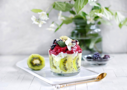 В креманку сначала выложить найскрим из киви, следующий слой йогурт, а после него найским из ежевики.