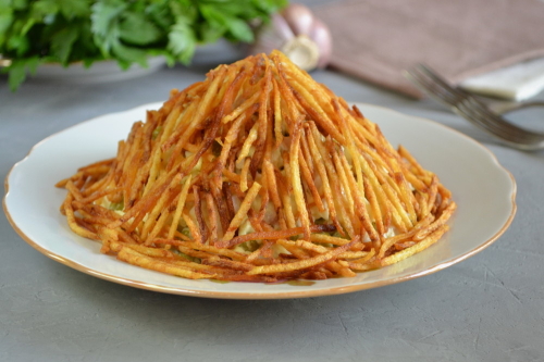 Залить тертый картофель водой и хорошо промыть.Обжарить на растительном масле картофель до золотистой корочки.Обсыпать салат картофелем сверху. Добавить мелко нашинкованный зеленый лук по кругу салата.Салат «Муравейник» готов. Можно подавать к столу.Приятного аппетита![/url][url=https://kedem.ru/recipe/salads/salat-muravejnik/#][/url][url=https://kedem.ru/recipe/salads/salat-muravejnik/#]