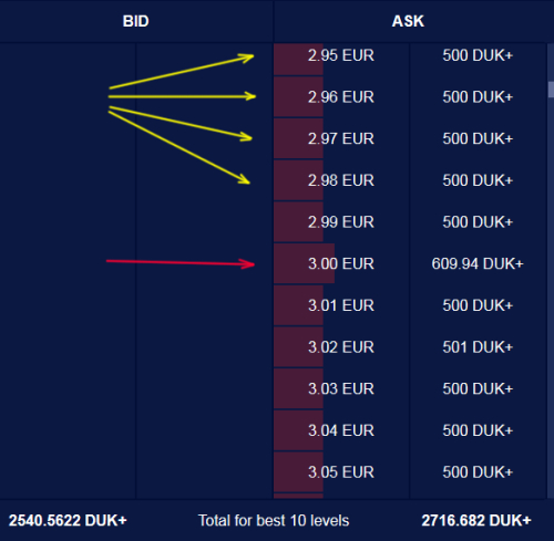 Вот уровни, четко показаны поставки Dukascoins самим банком, красивые лимитные ордера на продажу ровно по 500 DUK+ (я обозначила их желтыми стрелочками).